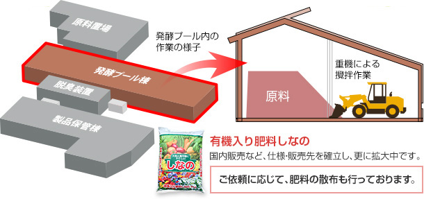発酵促進設備に力を入れ、食品残渣等を良質な有機肥料しなのに変え、大地をリサイクルします。 大型脱臭装置を新たに導入し、地域・周辺施設への臭気対策への臭気対策に重点的に取り組んでいます。